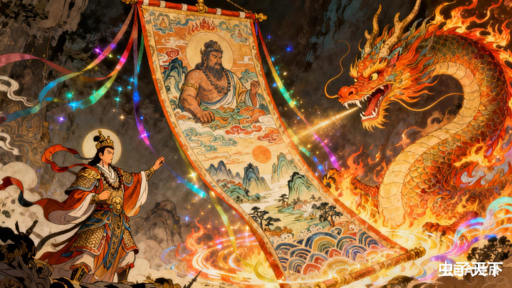 天尊抬手展动盘古幡,幡面一会儿显露盘古开天辟地的图景,都天使煞之气扑面而来,五色毫光将火龙拦在半空。